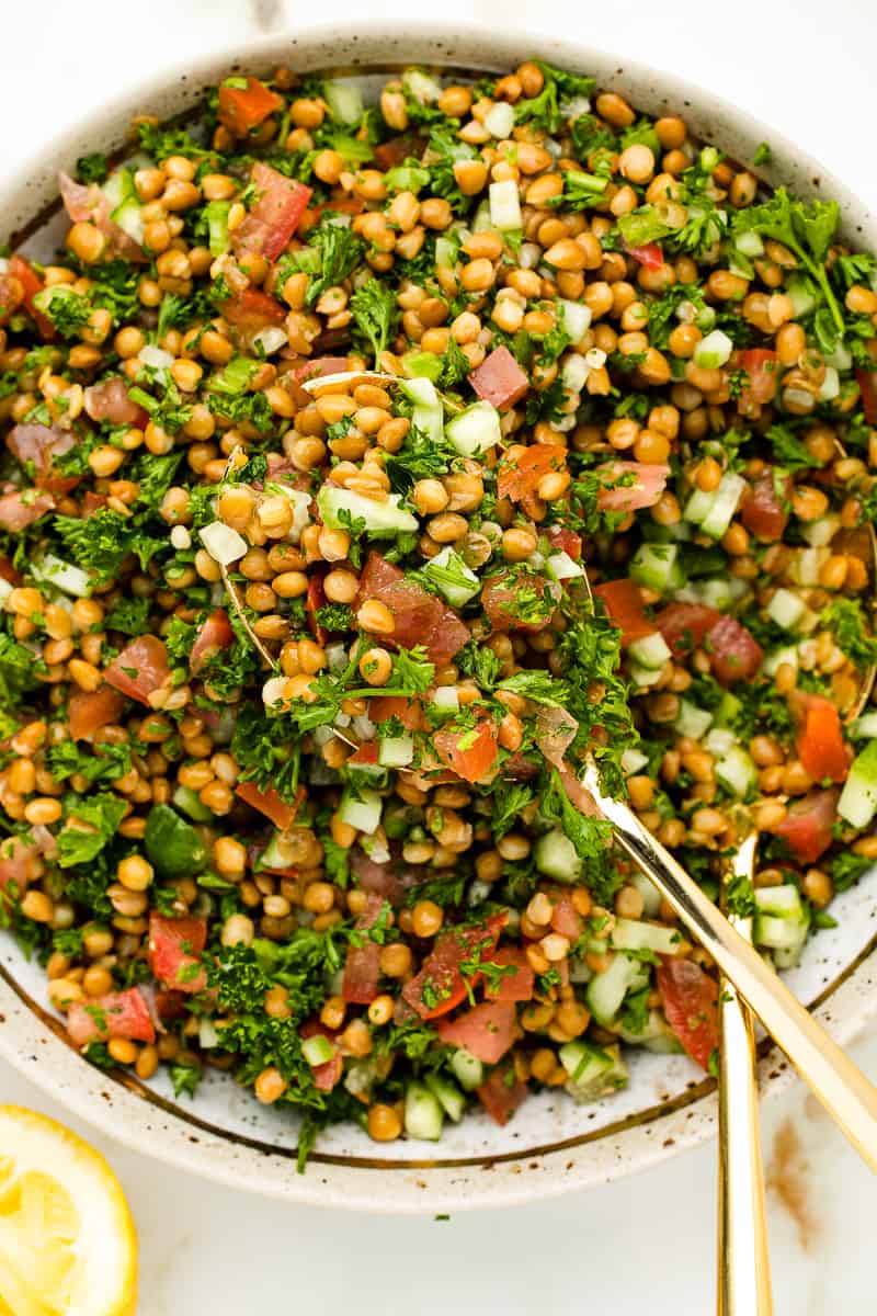 This Lentil Tabbouleh recipe is a copycat of the popular Mediterranean restaurant, Cava. Tender lentils are elevated into a fresh, bright salad, with parsley, cucumbers and tomatoes. Topped with a zesty and light dressing, there is no cooking required, and ready in under 10 minutes!