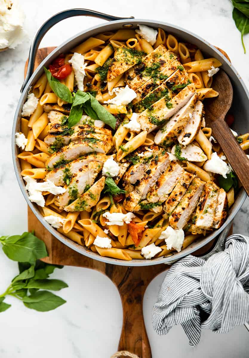 This Cheesecake Factory tomato basil pasta recipe is a copycat version of an oh-so-good favorite! Pasta in a tangy tomato sauce, get's finished with a fresh and bright basil oil, tender chicken and of course fresh mozzarella!